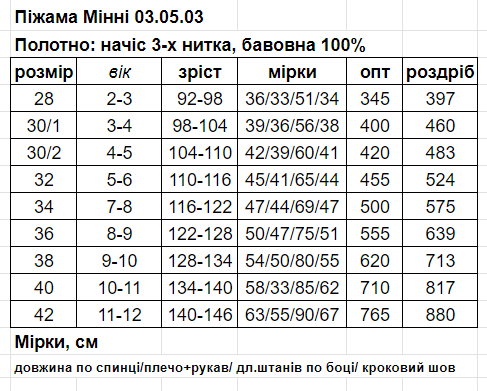 Опис: класична піжама, довгий рукав, довгі штанці. Рукава та штани на манжеті. На кофточку спереду мультяшна картинка (накатка, друк на тканині).